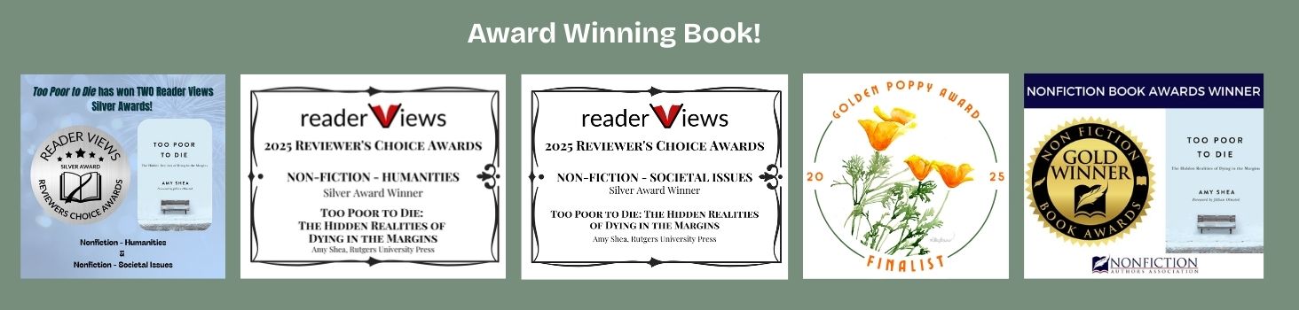 and the author of Too Poor to Die: The Hidden Realities of Dying in the Margins. Her work has appeared in The Missouri Review, Pangyrus, Portland Review, The Massachusetts Review, Spry Literary Journal, Fat City Review, From Glasgow to Saturn, & the Journal of Sociology of Health & Illness. She works as the Writing Program Director for Mount Tamalpais College, a free community college for the incarcerated people of San Quentin Rehabilitation Center.