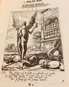 - Gemmell Special Collection #13 – Engravings by Rudolf and Conrad Meyer; J.G. Müller’s verses from the first edition are printed as an appendix. First published in Zürich, 1650, under the title Sterbenspiegel.